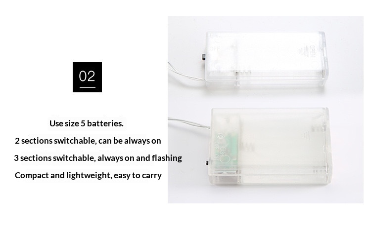 Power: 1.5m, 10 lights, battery box version; 3m, 20 lights, battery box version with flashing; 6m, 40 lights, battery box version with flashing